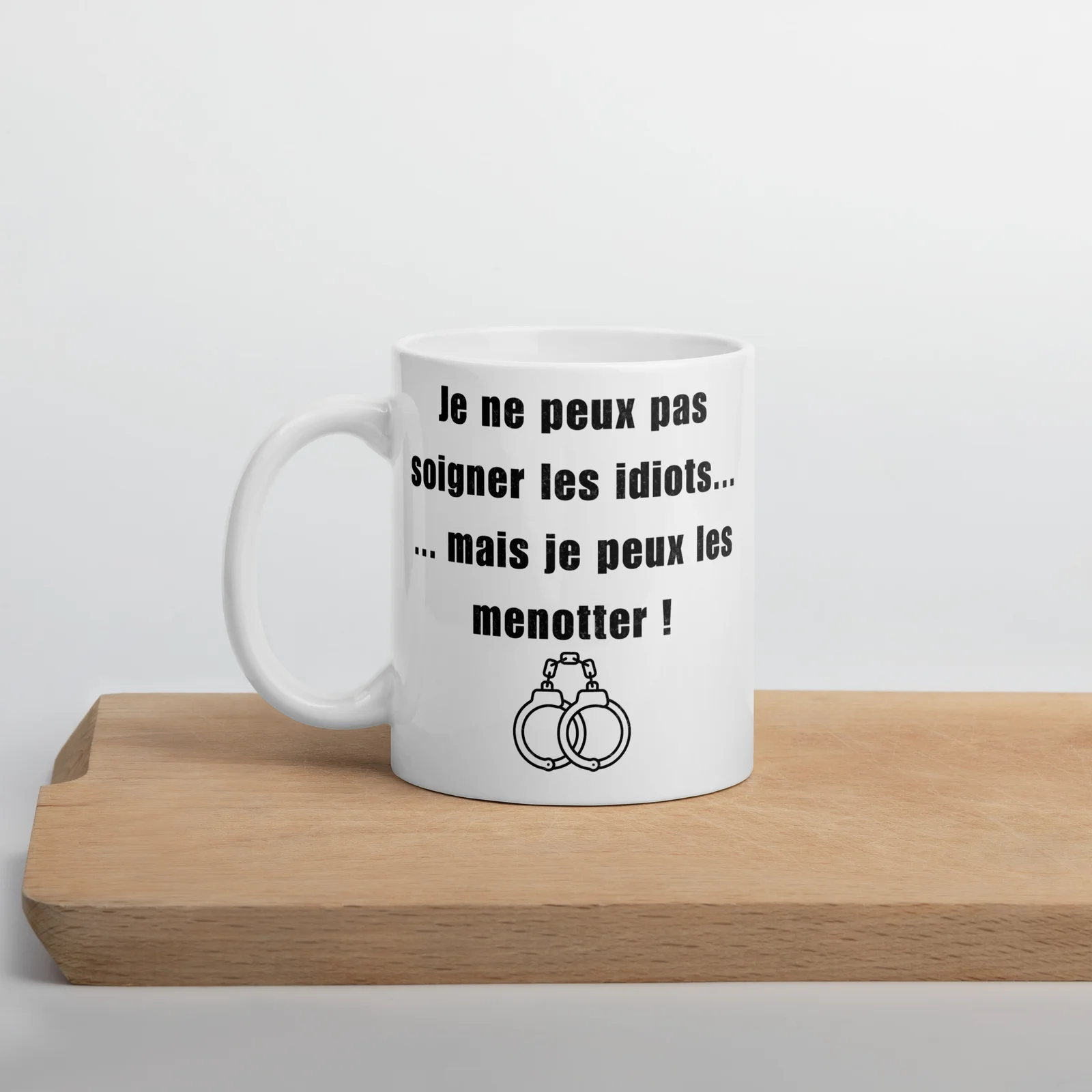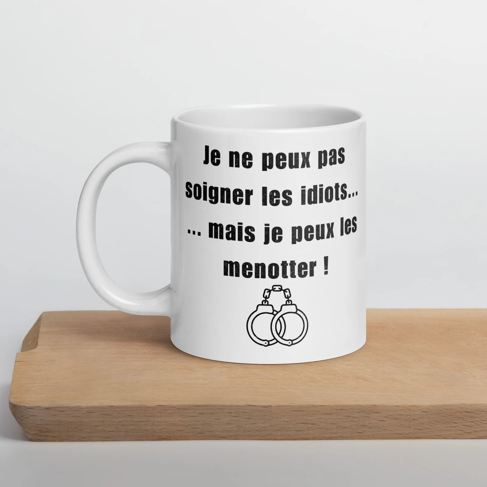 ☕ Mug Policier « Je ne peux pas soigner les idiots… mais je peux les menotter »