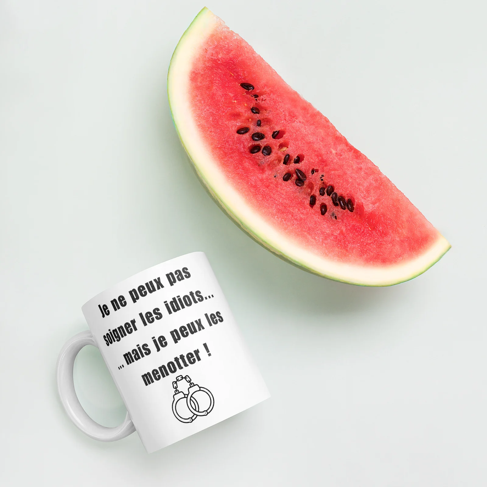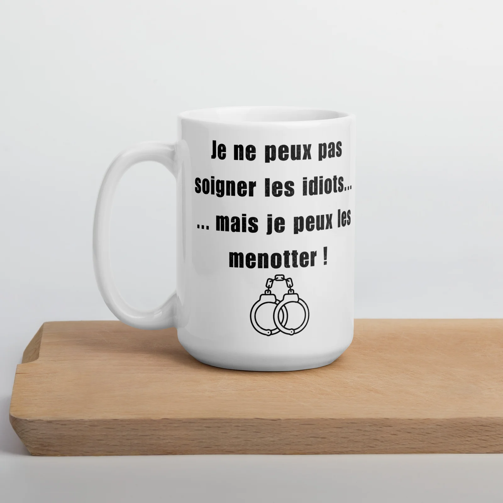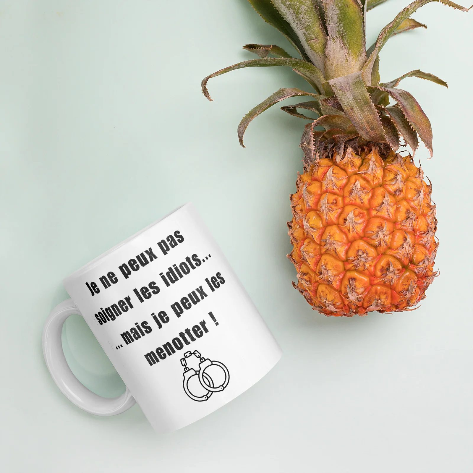 Texte percutant et visuel menottes : ce mug n’est pas qu’un récipient, c’est une déclaration d’appartenance au métier, avec l’humour qui fait la différence à la machine à café.
