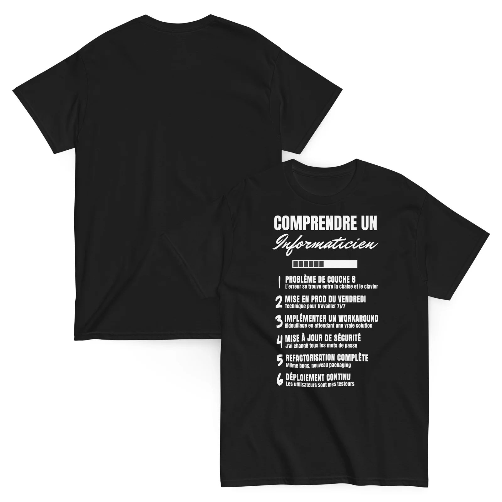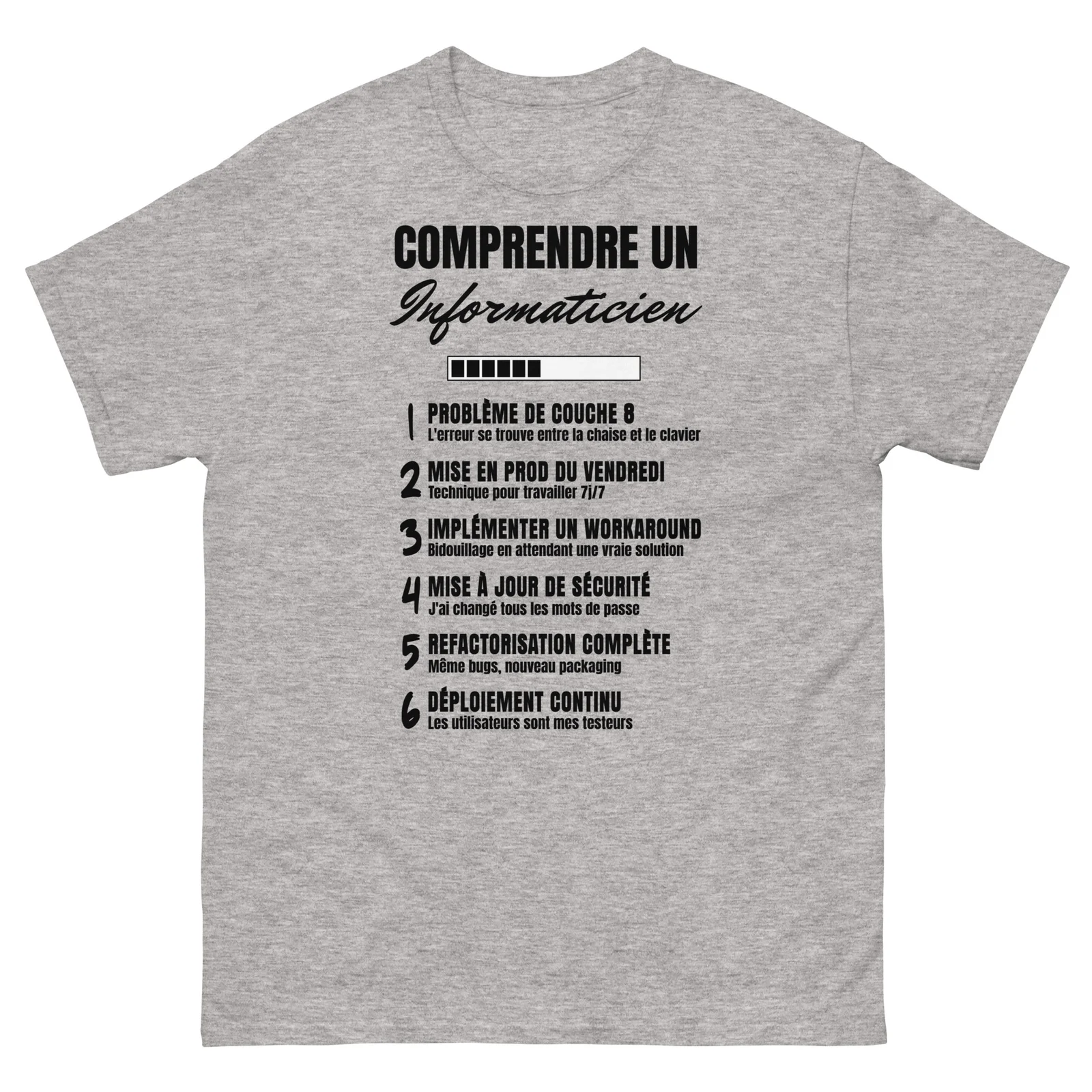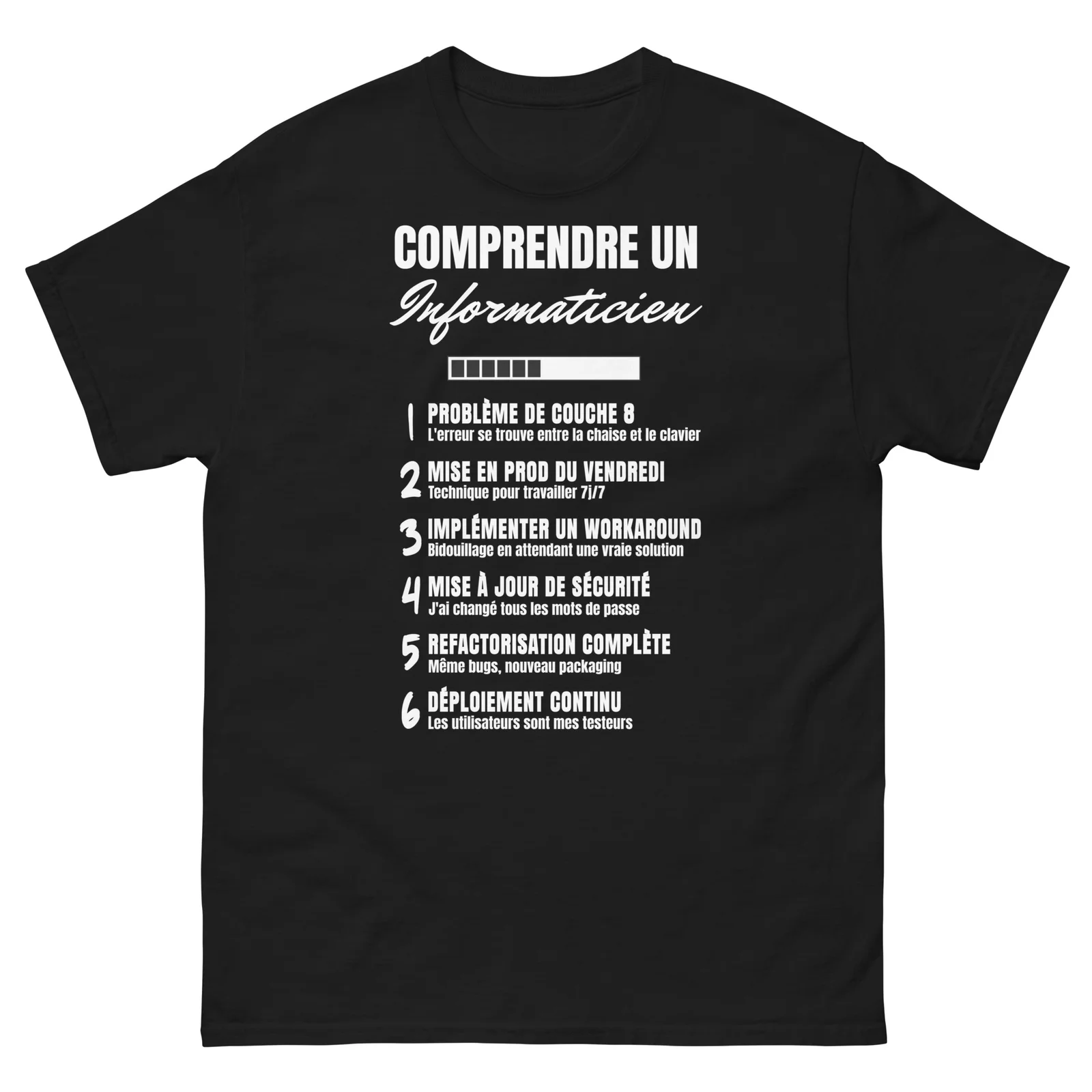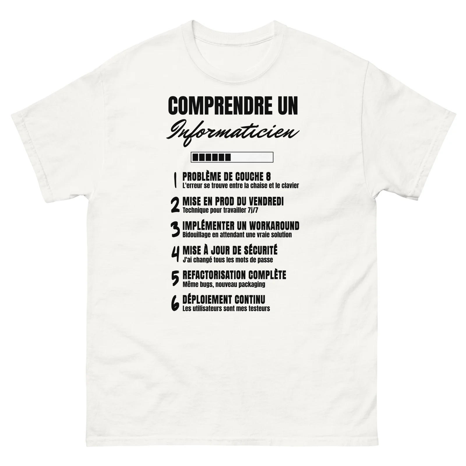 Ce t-shirt unique révèle avec humour les secrets du jargon informatique, idéal pour les pros de la tech qui assument leur quotidien ou pour offrir un cadeau qui fera mouche à votre informaticien préféré.